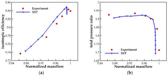 We validate the numerical method on the transonic compressor Stage 35, designed by NASA Glenn [33], for its detailed design and experimental data. The height of the first layer from the solid surface is set to 5 × 10−7 m to ensure that y+ is approximately 1.0 and the total grid nodes are 6.07 million. Figure 5 compares the calculated results and the experimental data, revealing that the mass flow near the stall is slightly higher than the experimental value, and the choke mass flow is slightly lower than the experimental value. The numerical efficiency characteristic is estimated to be a little higher, and the pressure ratio near the design point is in excellent agreement with experimental values. Overall, the computational fluid dynamics method adopted meets the numerical simulation accuracy required by the research.