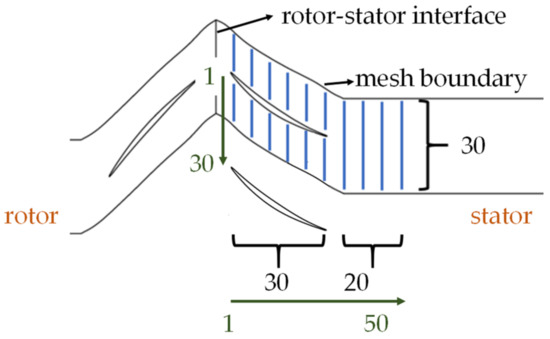 We set the monitor points on a stream surface with a constant radius to receive time-resolved data, as illustrated in Figure 6. The primary monitor points are set in the stator and one-third of the axial chord after the stator. Thirty points are evenly distributed in the circumferential direction from the suction side of one blade to the pressure side of the adjacent blade. Meanwhile, the monitor points that cross the mesh boundary are transformed to the inside of the mesh boundary. In the axial direction, 30 uniform monitor points from the LE to the TE are located, and 20 points have the same spacing as the fore points set after the TE. The radial direction is from the 0.8 span to the 0.99 span, and the spacing between adjacent monitor sections is 0.01 span. There are 20*50*30 monitor points for the specific transient flow analysis, and for other time-resolved data acquisition like velocity distribution in the wake region, the monitor points are set by adopting the above method.