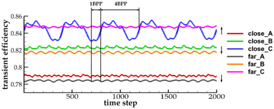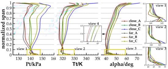 In the analysis of Section 4.1, we demonstrate that the stator loss near the 0.4 span in the “close” case decreases. The flow angle comparison in view 4 of Figure 11 highlights that the time-averaged flow angle difference at B and C is almost negligible, and the non-transitional boundary layer response affords “close”, giving more loss because of the existing deep wake just before the stator contributes to the loss [13].