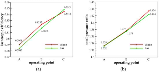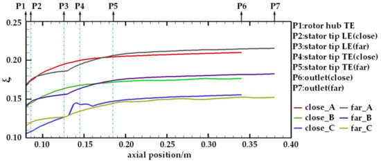 Figure 9 illustrates the development of ξ from rotor TE to the outlet, presenting the measurement station setting, which is appropriate due to the non-vertical edge. The loss generation trend for A and B operating conditions is the same. For the same operating condition with different axial spacing, the loss generated by the upstream rotor is almost the same, and at the front of the axial spacing, the loss generation rate of the “far” case is higher, before declining gradually before the stator. Overall, the loss generation rate in each stage is independent of operating conditions, regardless of the axial spacing.