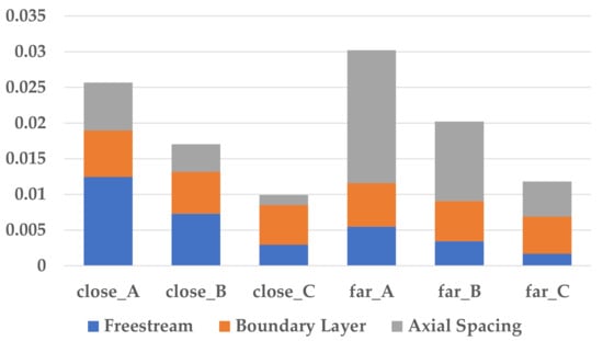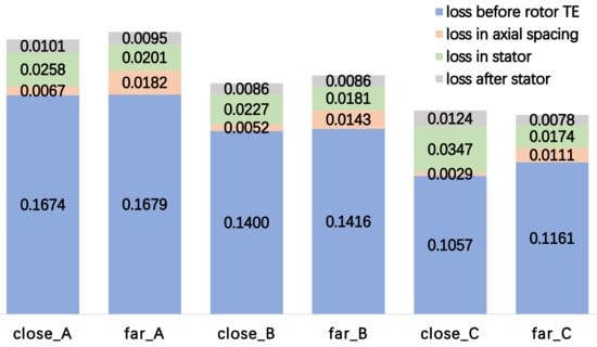 The overall loss is further decomposed into four parts, as depicted in Figure 10. In the compressor stage, the rotor loss is the bulk of the total loss, and the loss generation after the rotor is up to one-third of the total loss as in close_C. The loss difference at the rotor and after the stator is almost negligible at both points A and B; the stator loss is higher, and the spacing loss is lower. The decrease in efficiency from close to far is due to the decreased spacing loss. When the axial spacing increases, the growth rate of loss in the spacing is greater than the decay rate of loss in the stator. Therefore, it can be established that the closer the axial spacing, the higher the efficiency. According to the spacing from far to close at C, the potential effect of the downstream stator is favorable to the rotor, generating lower loss of about 0.01. Simultaneously, the loss in and after the stator increases sharply by 0.017 and 0.005, respectively, leading to a more significant total loss. In addition, it is worth noting that at A and B, the stator loss decreases as the axial spacing becomes larger, failing to present a total performance benefit from wake recovery.