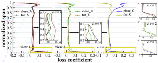 The parameter difference between A and B with either spacing is similar above the 0.3 span, indicating that the main characteristics of the unsteady interaction remain unchanged under these two conditions. From the 0.2 to 0.7 span, the loss of every section decreases as the load increases, regardless of the axial spacing. Meanwhile, the loss reduction of “close” is larger, and as a result, the loss of close_B near the 0.4 span drops to less than that of far_B, as shown in the close-up view 4 of Figure 11. Then the span range where the loss of “close” is lower becomes larger as the load continues to increase (view 5 of Figure 12).