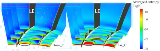 For operating condition C, the loss generated by the upstream rotor of “close” is lower than that of “far”, but the loss has a sharp rise in stator while the loss in the spacing is smaller than that of the other two conditions. Compared with the other two operating conditions, the loss decay rate of far_C is lower in spacing but higher in the stator.