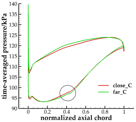 From Figure 11 and Figure 12, we observe that the hub leakage flow’s unloading effect makes the rotor’s loading capacity near the hub not change significantly with overall load increases. Additionally, the loss coefficient of “close” is always lower at every condition than “far”. According to the analysis, the mechanism of this phenomenon under the three operating conditions is consistent. Therefore, this paper considers condition C as an example to explain this. By comparison, we find that the intensity of the leakage vortex is greater at close_C (Figure 13). Indeed, the driving force of hub leakage vortex (HLV) is the pressure difference between the pressure surface (PS) and suction surface (SS) near the hub clearance, and the pressure distribution comparison at the 0.05 span between close_C and far_C is illustrated in Figure 14. The pressure distribution is the same in the fore 10% axial chord. The SS pressure of “close” is higher than that of “far” from 15% to 55% of the axial chord, but the pressure at PS of “close” is lower from 10% to 80% of the axial chord. The corresponding increase is also greater than the previous, indicating that the “close” driving force is lower and the formed HLV is weaker.
