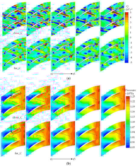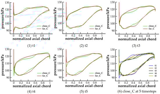 In Figure 15b, the dotted line represents the position of the wake. The flow transport caused by the wake negative jet [35] makes the fluid at the SS flow towards the pressure side, and the transverse transport makes the pressure field along the wake direction consistent. In Figure 15b and Figure 16, when at t1, the slip velocity of the wake is relatively large, and the high-pressure fluid transported to the PS significantly increases the pressure enhancing the pressure rise gradient. However, the high-pressure area near the trailing edge is smaller owing to its lower outlet pressure at close_C. Then at t2, the pressure distribution on the PS is almost the same. At t3, the pressure from 0.2 to 0.55 axial chord at close_C drops, and the pressure drop decreases in the next two moments.