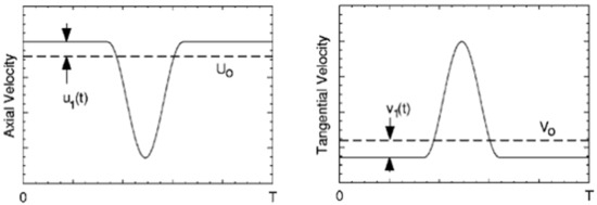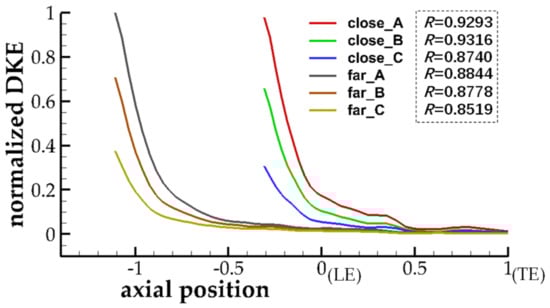 As mentioned in the introduction, Adamczyk [8] used the unsteady kinetic energy flux defined in Equation (4) to describe the flow unsteadiness, where and represent the axial and tangential velocity, as illustrated in Figure 17. The recovery parameter R is calculated from Equation (5). Van Zante [9] removed the pitch-wise operator and solely employed flow data at the mid-pitch, called disturbance kinetic energy(DKE), a method adopted in this paper.