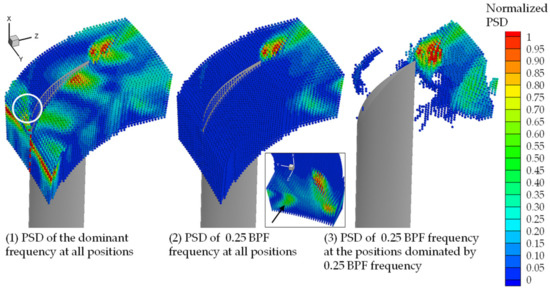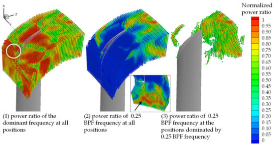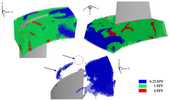 Moreover, we propose a dominant frequency screening method based on Fast Fourier Transform (FFT). FFT is used to analyze the data of every monitor point, and then we obtained the frequency corresponding to the maximum amplitude called dominant frequency. Figure 20 highlights that only three frequencies as dominant frequencies exist in the flow field, and they are 0.25, 1, and 4 times the BPF. The dominant frequency of four BPF is scattered in several isolated locations, and the effect on the entire flow is not apparent. The dominant frequency of one BPF occupies most positions inside the stator passage, but its dominant positions gradually decrease after the TE. The positions dominated by 0.25 BPF are very few in the stator passage, and one of them coincides with the tip separation boundary. However, this area discontinues before it develops to the TE. After the TE, the region dominated by 0.25 BPF gradually develops, becomes larger, and the frequency dominates the entire flow.