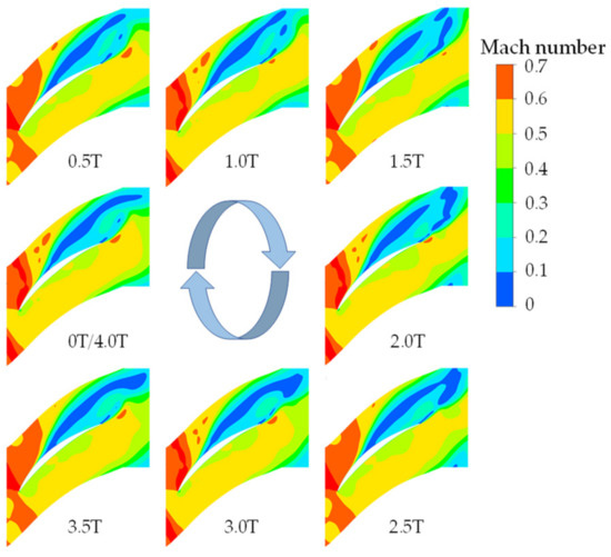 The numerical simulations utilize the 3-D unsteady Reynolds-Averaged Navier-Stokes (RANS) solver ANSYS CFX which uses a finite volume method to compute the flow field. The discrete scheme of the convection term is second-order, and thus, a second-order backward Euler is used for the time difference scheme. The shear stress transport turbulence model is also chosen, which is appropriate for unsteady flow research [31,32]. The radial distribution of the stagnation pressure, stagnation temperature, and flow angle is set for the inlet boundary, and the outlet boundary is set to the radial distribution of circumferentially averaged static pressure as indicated by the steady results. The mesh on the periodic boundary is matched and all solid surfaces are adiabatic and non-slip. Every physical time step that includes five iterations is set to 1% of the time in which the rotor rotated by one pitch. All unsteady cases started from their respective steady cases. After computing for about four revolutions, the periodic flow is obtained, and then all the required data is collected within another 20 pitches.