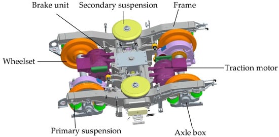 The contact and action between the rolling stock and the rail are carried out through the bogie. The bogie supports the entire train body and enables the train to run fast on the rail. The structure of the bogie is shown in Figure 1. The bogie is mainly composed of the frame, wheelset, axle box, primary suspension, secondary suspension, traction motor and braking unit. The wheelset is an essential part of the bogie and transfers the vehicle weight to the rails directly. Traction and braking force are generated by wheel–rail adhesion, and the vehicle is guided on the rail.