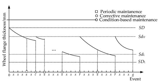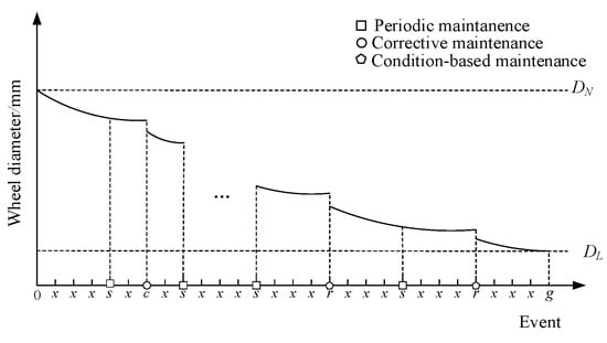 As shown in Figure 5, is the initial thickness of the wheel, and represents the floor of the thickness of the wheel flange. Once it is lower than , the wheelset cannot be put into service and must be reprofiled. and are the reprofiling strategy threshold. In Figure 6, represents the diameter value of a new wheelset. The wheelset is replaced as soon as the diameter is smaller than . As can be seen from the two figures, daily inspection and periodic inspection cannot eliminate wheel deterioration. If the damages on the tread surface do not exceed the limit during daily inspection, it is kept as it is. Otherwise, corrective maintenance is performed. During periodic inspection, if the flange thickness does not reach the lower limit , only cleaning and maintenance are performed. The reduction in the wheel diameter is the wear caused during running. If the thickness of the flange is at or below , preventive reprofiling is carried out to restore the flange thickness to , and the wheel diameter decreases correspondingly. The effect of preventive maintenance is imperfect. With the reprofiling number increasing, the maintenance effect decreases, and the failure probability increases gradually.