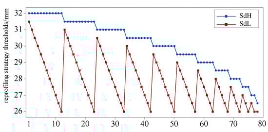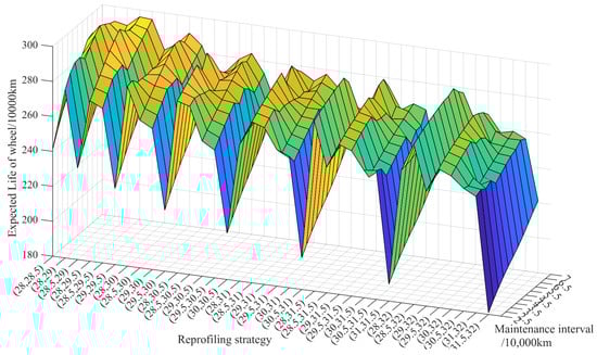 The target value of the proposed maintenance strategy was analyzed quantitatively. It can be seen from Table 5 that the choice of reprofiling strategy has an influence on the number of reprofiling. When the profiling strategy selects (31.5, 32), it needs to be reprofiled 14 times in total, and when choosing (30, 32), only 6 reprofiles are performed on the wheel. Frequent reprofiling causes a heavy work burden for maintenance personnel and affects maintenance planning.