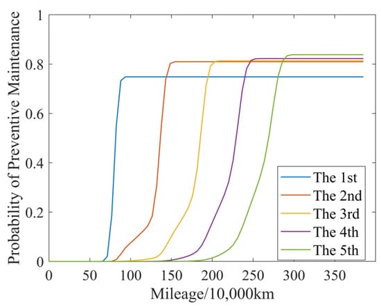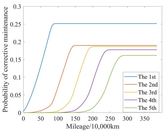 As the mileage increases, preventive and corrective maintenance probability increase, as shown in Figure 12 and Figure 13. With the increase in reprofiling times, the probability of preventive maintenance continues to rise, and the probability of corrective maintenance decreases. Preventive maintenance eliminates tread surface damage and restore the wheel status. Since the effect of preventive maintenance is imperfect, the interval between two preventive maintenances is shortened gradually, reducing the failure probability of the tread surface.