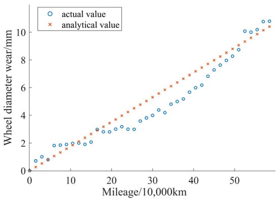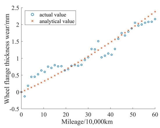 Cumulative shock models are often used in reliability analyses, life predictions and maintenance optimizations in recent years. It has been proven to be useful and efficient in maintenance optimization. In this paper, the wear values of the wheel diameter and wheel flange thickness obtained by the cumulative shock model were compared with the measurements, as shown in Figure 14 and Figure 15. It can be seen that the analytical values of the wheel diameter and the wheel flange are relatively close to their actual values. The method based on the shock model can describe the deterioration of the wheel diameter and flange well.