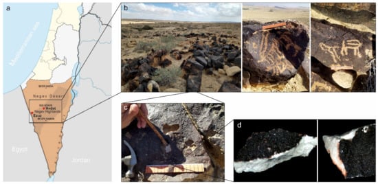 Map of the Negev desert indicating the location of the two petroglyph sites (a); view of the rock art site in Ezuz with examples of rock engravings (b); image of a sampling point (c); and the sample observed by stereomicroscope (6×) (d).