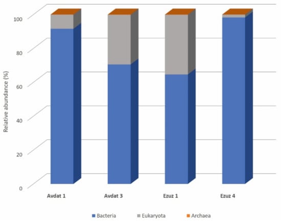 The results of the analyzed reads of the DNA sequencing data that could be phylogenetically assigned revealed a similar distribution of superkingdoms among the investigated samples (Figure 2), showing a microbiome dominated by bacteria, with a lower proportion of eukaryotes and a very small proportion of archaea. More specifically, samples AV1 and EZ4 showed the highest relative abundance of bacterial communities (92% and 98%, respectively), while the microbiomes of samples AV3 and EZ1 showed higher proportions of eukaryotes (29 and 35%, respectively). A very small fraction of identified reads was assigned to archaea, which represented less than 1% of the total microbiome of all the samples.