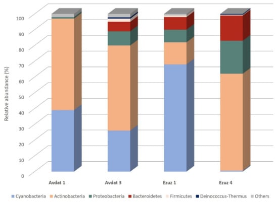 The most dominant phylum was Actinobacteria (54–61.5% of bacteria), with the exception of sample Ezuz 1, which showed a massive dominance of the phylum Cyanobacteria (68% of bacteria) and a lower proportion of Actinobacteria (14% of bacteria). The second most abundant phylum was Cyanobacteria in samples Avdat 1 and Avdat 3 (26–39% of bacteria), while in sample Ezuz 4, Cyanobacteria represented only 0.6% of the bacterial community. The phylum Proteobacteria was present with a relative high abundance (21% of bacteria) in Ezuz 4 and with lower proportions in the other samples (1–9%), followed by the phyla Bacteroidetes (6–16% of bacteria) and Firmicutes (0.5–2%). The last two phyla accounted for less than 0.5% in sample Avdat 1. The phylum Deinococcus-Thermus was identified in very low proportions in all the samples, reaching more than 0.5% only in samples Avdat 3 and Ezuz 4 (0.5–0.8% of bacteria).