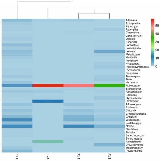 The phylum Bacteroidetes was well-represented in all the samples except AV1, in which this phylum was below 0.5% of the bacterial reads. Whitin this phylum, the class Cytophagia was the most abundant, with the genus Adhaeribacter being present in AV3, EZ1 and EZ4 (0.7–1.5% total reads) and the genus Hymenobacter only significantly identified in samples AV3 and EZ4. Interestingly, the Pontibacter genus was detected with a relative high abundance (12% of total reads) in sample EZ4 but did not account for more than 0.5% of the total reads in the other samples (Figure 4). The Chitinophagia class was present with more than 0.5% of bacterial reads only in samples AV3 and EZ1. Inside this class, only the genus Filimonas accounted for more than 0.5% of the total reads and was exclusively in sample EZ1.