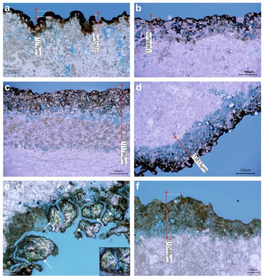 Pictures of the petrographic thin sections acquired with the Keyence digital microscope in transmitted light: (a) detail of the black varnish and of the reddish layer underneath it of sample AV1; (b–d) examples of the weathered area occurring beneath the black coating in samples EZ1, EZ3 and AV2; (e) weathered area colonized by cyanobacteria aggregates in sample AV1; (f) detail of the orange crust of sample EZ4.