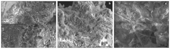 SEM–EDX was initially used for observation of the stone slabs without any preparation to detect the presence of microorganisms both in the crust and in the bedrock. On the black coating, no biological colonization was detected, but at the transversal section of the samples, putative bacteria (coccoid shape) were revealed (Figure 6a), occupying the microcavities close to the surface beneath the black layer. In other areas of the samples, cyanobacterial biofilms were detected (Figure 6b). In addition, on the surface of sample EZ4, fungal hyphae were observed (Figure 6c).