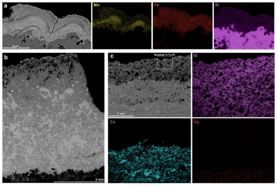 Examination of the black varnish in the petrographic thin sections revealed a clear micron-size laminated pattern (Figure 7a) with a curved shape and oriented parallel to the surface. This micro texture is defined as a stromatolite structure and is typical of desert varnish [17,19,27]. Mappings of the elemental composition of the black crust revealed that Mn and Fe are not homogeneously distributed, but their content varies in the different layers of the coating. Specifically, we observed that the upper part of the varnish is Mn-depleted, along with the part in contact with the bedrock, while an accumulation of Mn is present in the central area. Other elements such as Al, Mg and K are equally distributed throughout the crust. In addition, accumulation of detrital particles was observed in the depressions of the outer layer. These particles were mostly composed of clay minerals (Si, Al, K, Mg and Fe), while the Mn-rich material that characterizes the varnish is only present in the coating itself (Supplementary Figure S5). Surprisingly, no calcium was detected in the rock beneath the crust, but only silicon, which was in contrast with the results of XRF analyses. Therefore, a more thorough analysis of the bedrock was carried out through EDX punctual measurements, which revealed that the bedrock is composed of a calcitic matrix with lower content of Mg in which silicate grains and silicified microfossils are embedded. Interestingly, backscattered images of the thin sections (sample AV1 is reported as an example in Figure 7b) showed that the bedrock is not homogeneous and, in the areas corresponding to the porous weathered zones previously observed with the optical microscope, the calcitic matrix (light grey) is missing except for sporadic grains, and only the silicate component (dark grey) is left. This phenomenon is clearly illustrated in Figure 7c, where elemental mapping of the weathered area of sample EZ3 is reported. Mg is present only in the intact bedrock (and in the black varnish on the surface), while in the weathered layer in contact with it we observed an initial leaching of Ca, which then disappears completely in the upper layer, leaving a very porous zone. In this area we observed only the silicate component, which seems to be homogeneous throughout the sample. In the upper layer Al, K, Mg, Fe and Mn are distributed in the black crust, thus along the edges of the pores and on the surface of the sample (Supplementary Figure S5). In this area, barium sulphate was also detected (bright white grains in the backscattered image of Figure 7c) but mostly concentrated towards the surface of the sample (maximum of 400 µm depth).