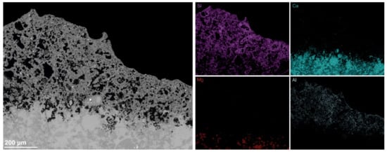 Punctual EDX analysis of the orange crust of sample EZ4 showed that it is mainly composed of Si, Fe, Al and K (as shown by XRF results), and a low proportion of Mn depending on the point of analysis. The elemental mapping carried out on this sample revealed some interesting results (Figure 8). We noticed that the distribution of the elements showed a pattern similar to the one displayed in the weathered areas of the other samples: Ca and Mg are detected only in the intact bedrock, while silicon is homogeneously distributed (in the bedrock and in the orange crust). In addition, the map of silicon showed the presence of silicified fossils in the orange layer. Aluminum is detected solely in the orange layer, with a distribution similar to that in the surface layer of sample EZ3, i.e., more concentrated along the edges of the pores, but in this case it appears more spread throughout the layer. Iron is mostly present in the orange part and seems to be homogenously distributed, while the mapping of Mn did not give a clear distribution.