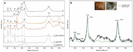 The spectra obtained on the orange layer emerging from the black varnish (Figure 9a—spectrum C) showed a spectral profile similar to the one of the orange crust of sample EZ4 (Figure 9a—spectrum D), showing characteristic features of iron oxides (bands around 220, 290 and 400 cm−1) and quartz (bands at 207 and 465 cm−1) at lower wavenumbers. In the range from 1000 to 1800 cm−1, EZ4 presented a complex spectrum, with overlapping broad bands that did not allow clear interpretation. The peaks in this range might be related to organic pigments such as carotenoids combined with amorphous carbon (peaks at 1320 and 1600 cm−1).