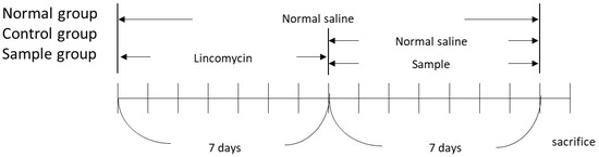 The in vivo investigations were supported by the Institutional Animal Care and Use Committee (Internal Review Board deliberation number: KBIO-IACUC-2018-106). BALB/c mice (6-weeks-old), with an average body weight of 20–21 g, supplied by Daehan Biolink (Chungcheongbuk-do, Korea) were used in the experiment. The animals were maintained in a room under standard laboratory condition with a 12:12 h light–dark cycle with a constant temperature of 22 ± 2 °C and humidity of 55 ± 10%. All animals were alive until the end of the experiment, and after the end of the experiment, they were anesthetized and euthanized. All procedures involving animals throughout the experiments were conducted in strict accordance with the legislation on the use and care of laboratory animals. Moreover, all efforts were made to minimize suffering. After 7 d of acclimatization, a total of four groups (n = 5/group) were tested: control group, untreated group (normal), and two experimental groups (sample 1: Lizhong-tang; sample 2: M. officinalis). To establish the AAD model, lincomycin was orally administered to the animals at a dosage of 3 g/kg, twice daily (8 h apart) for 7 d. The untreated group (normal) was administered the same amount of physiological saline without lincomycin. After constructing the AAD model, a 10 mL/kg sample (M. officinalis or Lizhong-tang) was administered to the experimental group (sample) twice a day, while the control group was administered saline twice daily. The body weight, water intake, and diarrhea (diarrheal status score) were assessed for all the groups. At the end of the experiment, animals were first anesthetized using 2% isoflurane O2 inhalation, and the intestinal tissues were dissected and their fecal contents were collected under sterile conditions and stored at −80 °C. The stored tissues were analyzed for diversity and community structure of the gut microbiota using terminal restriction fragment length polymorphism (T-RFLP) (Figure 1)