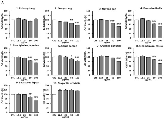 In this study, we tested 10 herbal medicines (3 prescription drugs and 7 plant-based herbal medicines). The prescriptions were Lizhong-tang, Osuyu-tang, and Oryeng-san. Lizhong-tang consists of Panax ginseng, Atractylodes lancea, Zingiber officinale Rosc, and Glycyrrhiza glabra; Osuyu-tang consists of osuyu, Zingiber officinale, Panax ginseng, and Ziziphus jujuba Mill; and Oryeong-san consists of Alisma canaliculatum, Poria cocos, Crepidiastrum platyphyllum, and Magnolia officinalis. The seven herbal medicines tested included Paeoniae radix, Atractylodes lancea, Coicis semen, Angelica dahurica, Cinamomum cassia, Saussurea lappa, and Magnolia officinalis. Herbal medicines were purchased from the Department of Pharmacy, Cheonan Oriental Medicine Hospital, Daejeon University, Korea. For the three prescriptions, the amount of medicinal ingredients was formulated according to the ratio of the existing medicinal ingredients, by referring to Bang-Yak-Hap-Pyun [20] and Donguibogam [21]. Lizhong-tang contained 24 g of Panax ginseng, 24 g of Atractylodes lancea, 24 g of Zingiber officinale Rosc, and 12 g of Glycyrrhiza glabra. Osuyu-tang contained 12 g of osuyu, 9 g of Atractylodes lancea, 6 g of Panax ginseng, and 4.5 g of Ziziphus jujuba Mill. Oryeong-san contained 30 g of Alisma canaliculatum, 18 g of Poria cocos and Atractylodes lancea, 18 g of Polyporus umbellatus, and 6 g of Cinamomum cassia. In total, 40 g of each of the seven herbal medicines was used. The medicinal material was extracted by boiling the herbs in 1000 mL of water at 100 °C for 150 min.