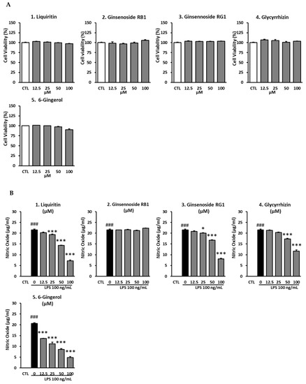 Inhibitory effects of liquiritin, ginsenoside Rb1, ginsenoside Rg1, glycyrrhizin, and 6-gingerol in RAW 264.7 cells. The cells were pre-treated with various concentrations of active compounds from Lizhong-tang (liquiritin, ginsenoside Rb1, ginsenoside Rg1, glycyrrhizin, and 6-gingerol). (A): Cytotoxic effects of the active compounds of Lizhong-tang. (B): Inhibition of nitric oxide production by the active compounds of Lizhong-tang. RAW 264.7 cells were treated with lipopolysaccharide (LPS; 100 ng/mL) and samples. The data have been represented as mean ± SEM. Statistical significance was evaluated by means of ANOVA followed by Tukey’s post-hoc test, using software R version 3.3.3. ### p < 0.001, as compared to the normal group; * p < 0.05, and *** p < 0.001, as compared to the LPS-treated group.
