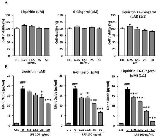 Liquiritin and 6-gingerol were mixed in a 1:1 ratio to reach the final concentrations of 6.25, 12.5, 25, and 50 μM to evaluate the effect of the mixture on the inhibition of NO production. No cytotoxicity of liquiritin and 6-gingerol was observed at 6.25, 12.5, 25, and 50 μM, similar to that seen in the untreated group. In the group stimulated with 100 ng/mL LPS, the NO level was 18.48 ± 1.06 μg/mL, while that in the experimental groups treated with liquiritin and 6-gingerol at 6.25 μM, 12.5 μM, and 25 μM were 14.52.81 ± 0.25 μg/mL, 12.24 ± 0.42 μg/mL, and 7.43 ± 0.44 μg/mL, respectively. In the group treated with 50 μM liquiritin and 6-gingerol, the NO level was 2.24 ± 0.19 μg/mL, which was lower (p < 0.001) than that in the LPS-stimulated group (Figure 4).