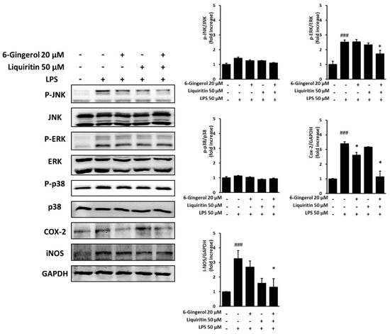 Inhibitory effects of liquiritin and 6-gingerol on the protein expression levels of p-JNK, p-ERK, p-p38, COX-2, and iNOS in RAW 264.7 cells. The cells were pre-treated with various concentrations of liquiritin and 6-gingerol, following which the cells were treated with LPS (100 ng/mL) for 20 h. The phosphorylation levels of p-JNK, p-ERK, p-p38, COX-2, and iNOS were analyzed using Western blot. The data are presented as mean ± SEM. Statistical significance was assessed by means of ANOVA followed by Tukey’s post-hoc test, using software R version 3.3.3. ### p < 0.001, compared to the normal group; * p < 0.05, compared to the LPS-treated group.