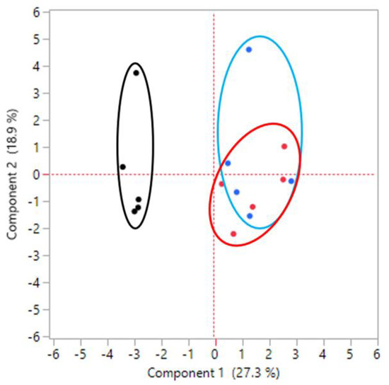 Principal component analysis showing the difference in the small intestinal microbiota composition between groups. Black dot: normal group, without treatment. Blue dot: control group, with antibiotic-associated diarrhea (AAD). Red dot: sample group, Lizhong-tang-administered group, post-AAD establishment.
