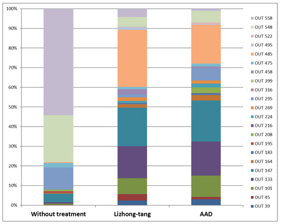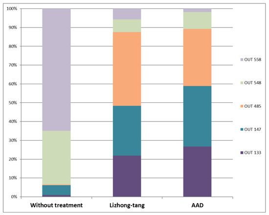 T-RFLP analysis was performed on the intestinal tissues containing fecal contents to determine the effect of Lizhong-tang on intestinal microflora control, using CNGB (mouse and human) and MICA3.0 (RDP 16S bacterial rRNA) databases. Table 2 shows a database-based list of the bacteria expected to be included in each OTU community (Table 2). By means of T-RFLP analysis, it was found that the intestinal microbial communities of the mice in the untreated (normal), control (control), and Lizhong-tang-administered groups were changed substantially. The antibiotics-administered group showed a change in the intestinal microbial community compared to that of the untreated group, while the Lizhong-tang-administered group showed a change in the intestinal microbial community compared to that of the control group. This indicated the similarity within each group and the independence between the three groups, indicating successful establishment of the AAD model (Figure 6). The untreated group had the highest contents of OTU548 and OTU558 (Table 3). The control group showed an increase in OTU485, but its content of OTU558 and OTU548 decreased, compared to that in the untreated group (normal). The Lizhong-tang-administered group showed an increase in the OTU147 and OTU133 content, compared to that in the control group (Figure 7 and Figure 8).