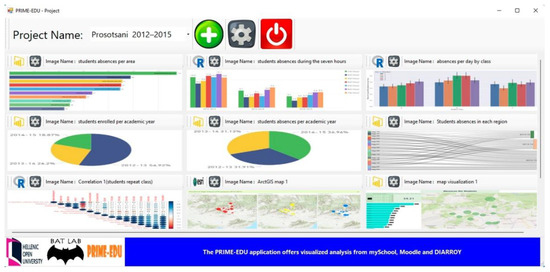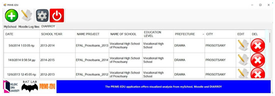 It receives data from other educational applications, such as from MySchool, Moodle, Leak, and Classter. In more detail, MySchool is an online application designed by the Greek Ministry of Education, and it is used by all Greek secondary schools, whereas Moodle is a widely used web application used for asynchronous education. Leakage is a windows desktop application designed and developed by our team that offers telematics services to reduce ESL and educational dropout. Finally, Classter is a web application of the company Vertitech that aims to manage the educational process in the life cycle of an organization such as primary, high school tuition, and general or vocational high school.