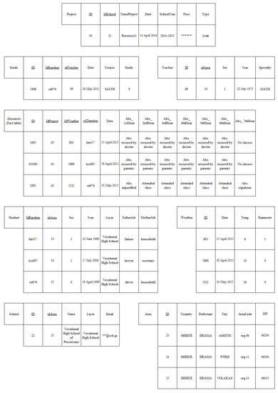 As shown in Figure 2, the design of the cloud warehouse database was in the form of a snowflake schema. The transaction fact table included the students’ absences per hour in the daily school schedule, the total students’ absences per school day, and the students’ absences due to the fact of illness. The dimensional tables included project characteristics and characteristics that affected students’ attendance such as weather, teachers, grades, and student characteristics (without including properties that reveal the student’s identity).