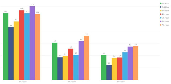 To begin with, certain simple graphs allow educators to draw simple conclusions regarding students’ data. The bar chart from the three-year period (Figure 5) indicated that students from certain regions (i.e., Mikropoli, Petroussa, Volakas, Kali Vrysi, and Anthochori) tended to miss courses more frequently. The abovementioned areas have a long distance from the school, and students from these areas had many absences during the first year (2012–2013) out of the three years in our research, but, subsequently, they were able to reduce them with the help of the early warning system (Table 1). Moreover, it was obvious that during every school year (between 2012 and 2015) it was always the first hour of the daily schedule that was the most likely to be missed (Figure 6). This is usually due to the fact of transport-related problems, bad weather and bad sleeping habits.
