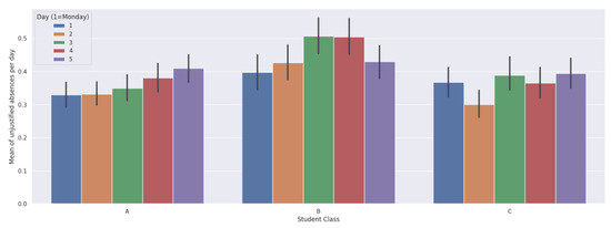 Total number of absences per day by class (Where A represents the first grade, B represents the second grade and C represents the third grade of the Vocational Highschool).