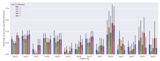 Students in the second grade of the vocational high school tended to skip classes unexcused more than the other students (Figure 7). This happened mostly in the middle of the week.