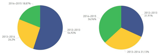 The pie chart in the left part of Figure 9 provides information about the percentage of students’ enrollments during three successive school years. Additionally, in the right part of Figure 9, the quota of total absences for the same period is shown. That is, in the total of the three years 2012–2015 of our research, the students in the 1st year were 31.91%, in the 2nd year 31.14%, and in the 3rd year 36.6%. There was a descending percentage of absences while the number of students during the same period was either almost the same or increased. Vocational schools in Greece follow an inclusive policy, gathering many students from vulnerable groups. Practices that can be considered as strict or demanding may discourage student admission by increasing the fear of failure. The eventual rise in the enrollment of students and the parallel drop in students’ absences indicate that the implementation of our system had a positive acceptance rather than created a feeling of freedom restriction.