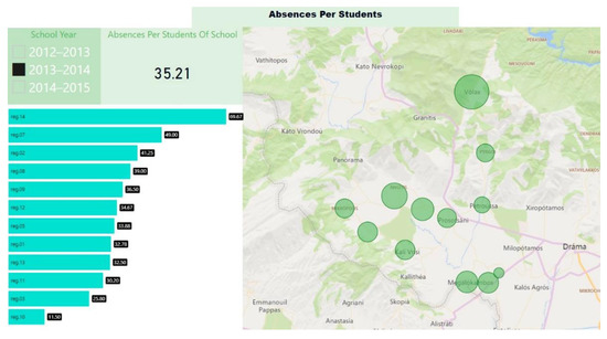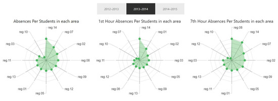 Radar charts (or spider charts) are mainly used to compare categorical attributes. Each axis represents an area, so it is easy to rank them by ascending order. This is important because it allows teachers to instantly draw conclusions regarding the progression of absenteeism compared with other schools, indicating performance and improvement. The three-fold diagram of Figure 10 was created with Microsoft Radar Chart (ver.2.0.2.0, 2019, Microsoft Power BI, USA), and it indicated a change in the school’s rank depending on the type of absenteeism. The absences per student are compared to the frequency of skipping the first class and the absence during the last hour of school. Differences in the areas’ order between these three diagrams can be indicative of factors affecting absenteeism. The visualization is dynamic, allowing teachers to choose the school year and have a constantly updated view of the new incoming data.