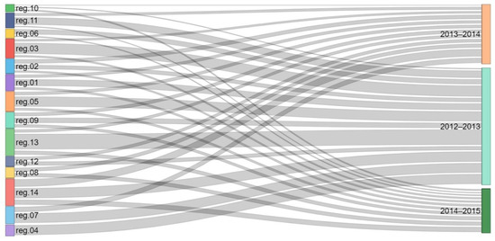 To imprint the contribution of a variable in the overall flow, the flow diagram called Sankey was used. In particular, in Figure 11 the contribution of each region presented in Table 1 to the total number of absences during three successive school years is shown. Links are weighted to using the number of total absences so thicker lines indicate a greater contribution to the absenteeism phenomenon.