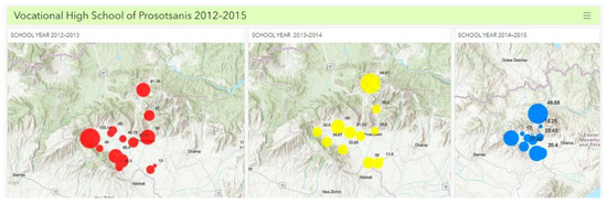 Figure 12 was compiled with our system and the ArcGIS application, which helps to visualize the data using interactive maps. The star schema storage allows us the choice of visualizing different schools or different school years. In Figure 12, the total number of students’ absences in the area per student is shown. Different colors represent different years: the school year 2012–2013 is red, the year 2013–2014 is yellow, and the year 2014–2015 is blue. This visualization helps the teachers to identify absenteeism problems in students from a specific area and thus to relate them to relevant factors, such as transportation problems and eventually to determine if the problem was effectively managed over time.