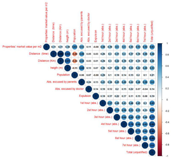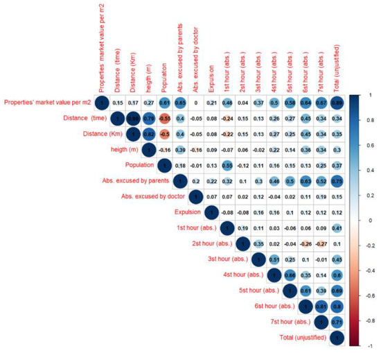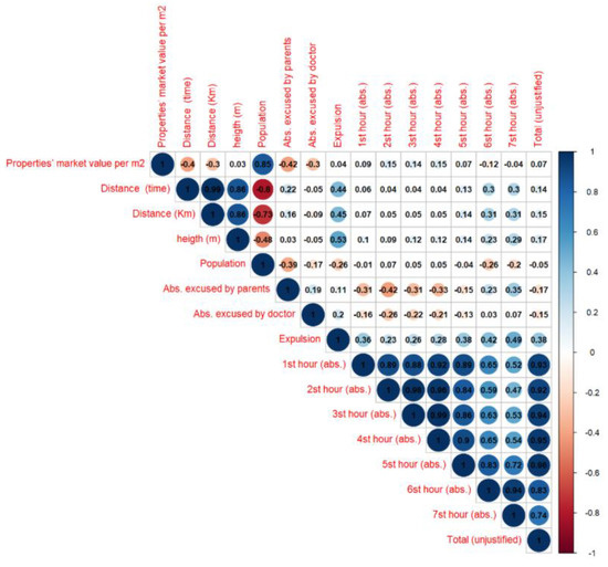 The number of absences due to the fact of expulsion was positively but not significantly correlated with the distance (r(23) = 0.45, p = 0.16) but weakly and negatively correlated with the population (r(23) = 0.17, p = 0.02). Additionally, there was a positive correlation between the number of expulsion absences and the total number of absences (r(23) = 0.38, p = 0.00), showing that the tendency to skip classes regularly often comes with behavioral difficulties. In the study by Sara et al. [46], which was conducted in Denmark, four characteristics that influenced school dropout were highlighted: class size, school size, last month’s absences, and average income per postal code.