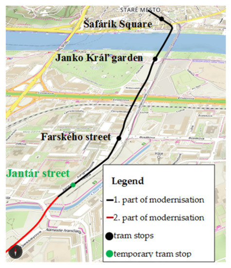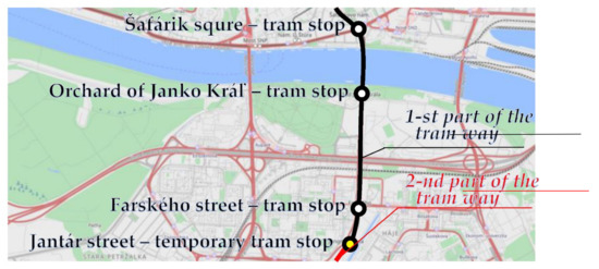 The modernisation of the tram line in question is based on the concept of the gradual renewal of the railway infrastructure in Bratislava. It aims to increase the performance of urban public transport and improve the comfort and satisfaction of passengers. A turning point occurred in 2003 when the heavy metro project, which started in the 1980s, was rejected. The alternative is a system of “fast trams”—tram rapid transit—running across the Danube from the historic core of the city to the end of the largest residential area in Bratislava—Petržalka—along the route of the originally envisaged metro and connecting it to the existing tram network. The requirement for modernisation resulted mainly from the technically obsolete and thus unsatisfactory condition of the tram line and the signalling elements on the line and the negative impact of the line on the environment (especially in the area of noise and vibration). In connection with the considered combination of the tram line with the TEN-T train transport (construction of a dual gauge line—1000 mm and 1435 mm), the first part of the modernisation of the so-called Petržalka radial was proposed in 2013. The first part of the construction works included the modernisation of the Old Bridge (replacement with a new bridge structure) and the construction of a double-track line in the length of 2.4 km (from the crossing of Štúr and Jesenský Street to the crossing of Jantár Street and Rusovce Road). The second part of the modernisation considers the extension of the tram line to the Petržalka District. Figure 2 demonstrates the modernisation of the tram line section in question [29].