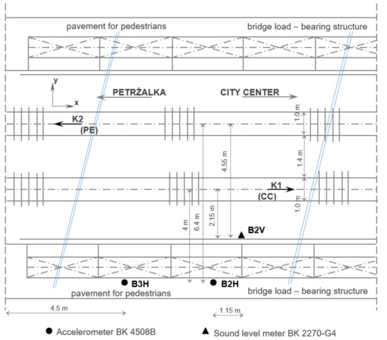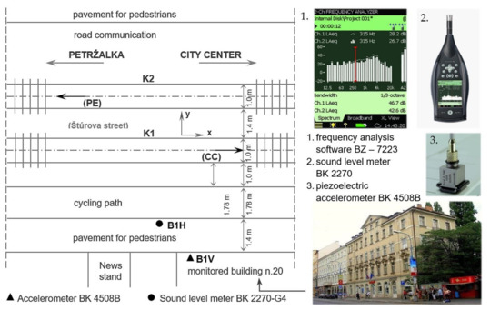 Figure 5 schematically demonstrates the position of the two measuring points B1H and B1V. Two independent measurement sets were applied. An assembly with a precise integrating sound level meter for measuring the noise situation was placed in place B1H. The system uses verified acoustic software by Brüel and Kjær (BK) [34,35]. Its distance from the nearest tram line track (K1) in the direction of Petržalka-Centre is about 3.0 m. The track of the K2 tram line in the direction of Centre-Petržalka is about 5.4 m away from point B1H. The set for measuring noise effects included a BK sound meter type 2270-G4 with modules for sound level meter BZ—7111, octave frequency analysis BZ—7223, and time recording BZ—7224; measuring microphone BK, type 4189; and acoustic calibrator BK, type 4231.