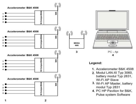 In order to obtain objective dynamic results, a specific measurement and evaluation line was set up at the B1V point. The set for measuring dynamic effects included the BK 4508 B accelerometer, LAN-XI module type 3060, battery module Type 2831, Wi-Fi AP Slave, Wi-Fi AP Master, battery module type 2831, and PC HP Pavilion for B&K (Figure 6). The accelerometer for measuring the level of vibrations from the operation of the tram line was located on the foundation structure of the building at pavement level. Its distance from the nearest track ET (K1) is approximately 4.2 m, and the track K2 is approximately 6.6 m from B1V.
