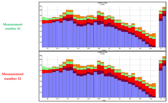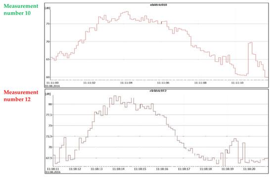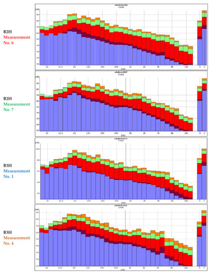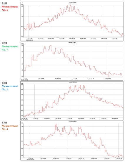 Figure 16 and Figure 17 demonstrate the time histories of the values of the noise levels LAeq and the frequency spectra of the values of the noise levels of the selected measurements. These measurements determined the noise levels LAeq (measurements no. 6 and 7 for point B2H, and measurements no. 1 and 4 for point B3H) from the extreme values. The values of noise levels in the 1/3 octave frequency spectrum band are specified in Table 7.