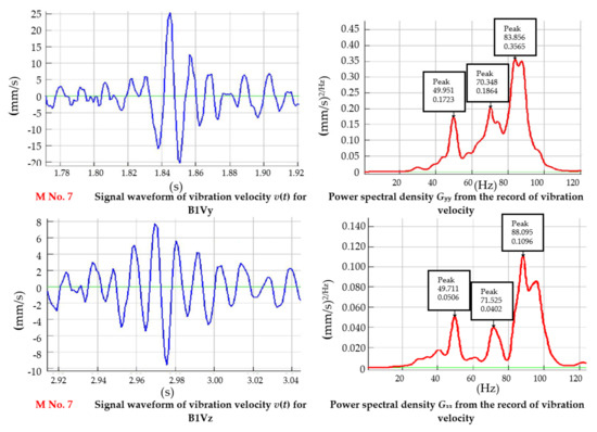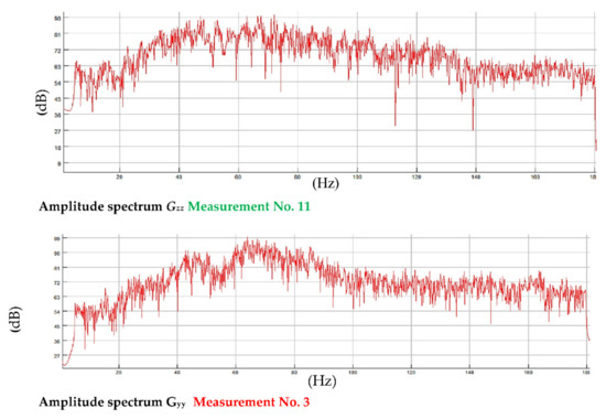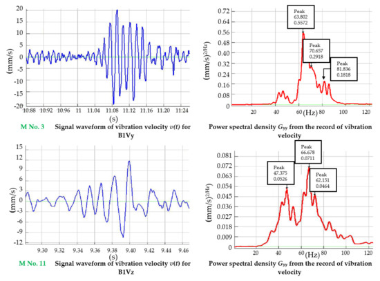 Spectral analysis provided results in the form of 48 Sii(f) autospectres, from which the dominant frequencies of the dynamic response at the measured points were determined. At the same time, spectral analysis was performed using PULSE BK software. The result was 48 power spectral densities Gii(f). Figure 18 demonstrates the time history of the vibration amplitudes v(t) with the results of the spectral analysis Gii(f) for measurement no. 1 with extreme values of amplitudes of vibration velocity vrms at points B2Vy and B2Vz during excitation on track K1.