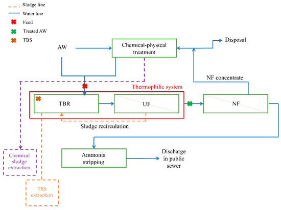 Among the biological treatments, the scientific community agrees that thermophilic treatments can perform high yields of removal additionally in the case of recalcitrant pollutants [8,9]. While mesophilic bacteria are widely used in the treatment of urban wastewater and work in a temperature range of 15–30 °C, thermophilic biota are widely used for the treatment of AW and find optimal conditions at temperatures between 50–60 °C [10]. For instance, in previous works, a thermophilic biological process was combined with an ultrafiltration membrane system to overcome sludge settleability issues and maximize performance, guaranteeing purification yields of the organic load of 95% [11]. This technology also granted the ability to treat different types of pollutants in high-strength AW in terms of COD content and surfactants [12] being applied in two full-scale plants [13,14].