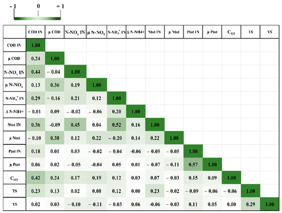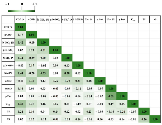Spearman’s correlation matrix shows very similar results (Figure 3). Further, in this case, there is a negative correlation between ammonia entering the plant and the reduction yields of removal COD and total nitrogen. We can see that the correlation coefficient passes from the value of −0.16 in the matrix P to a value −0.29 in the matrix S. These results confirm the negative correlation between these two parameters, ammonia, and fed COD. It is possible to see a solid positive correlation between the nitrates fed to the system and the total nitrogen fed. This correlation can be explained considering that nitrates are the most considerable portion of the nitrogen forms treated by the thermophilic biological system. Also, a negative correlation index of total phosphorus removal vs. TS (−0.03) was pointed out.